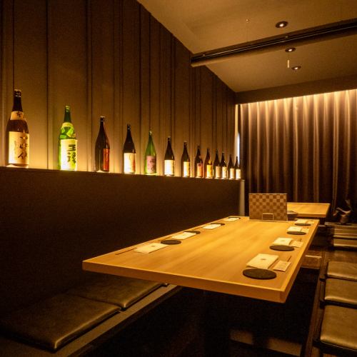 店内は落ち着いた大人の雰囲気で包まれており、間接照明が醸し出す輝きが特徴的です。2~4名様までのボックステーブル席をご用意しておりますのでデートやご友人とのお食事会には特に最適です。ゆったりとした時間を過ごしながら上質な料理とお酒を味わってください。最大20名様の貸切も可能となりますので是非ご利用下さい